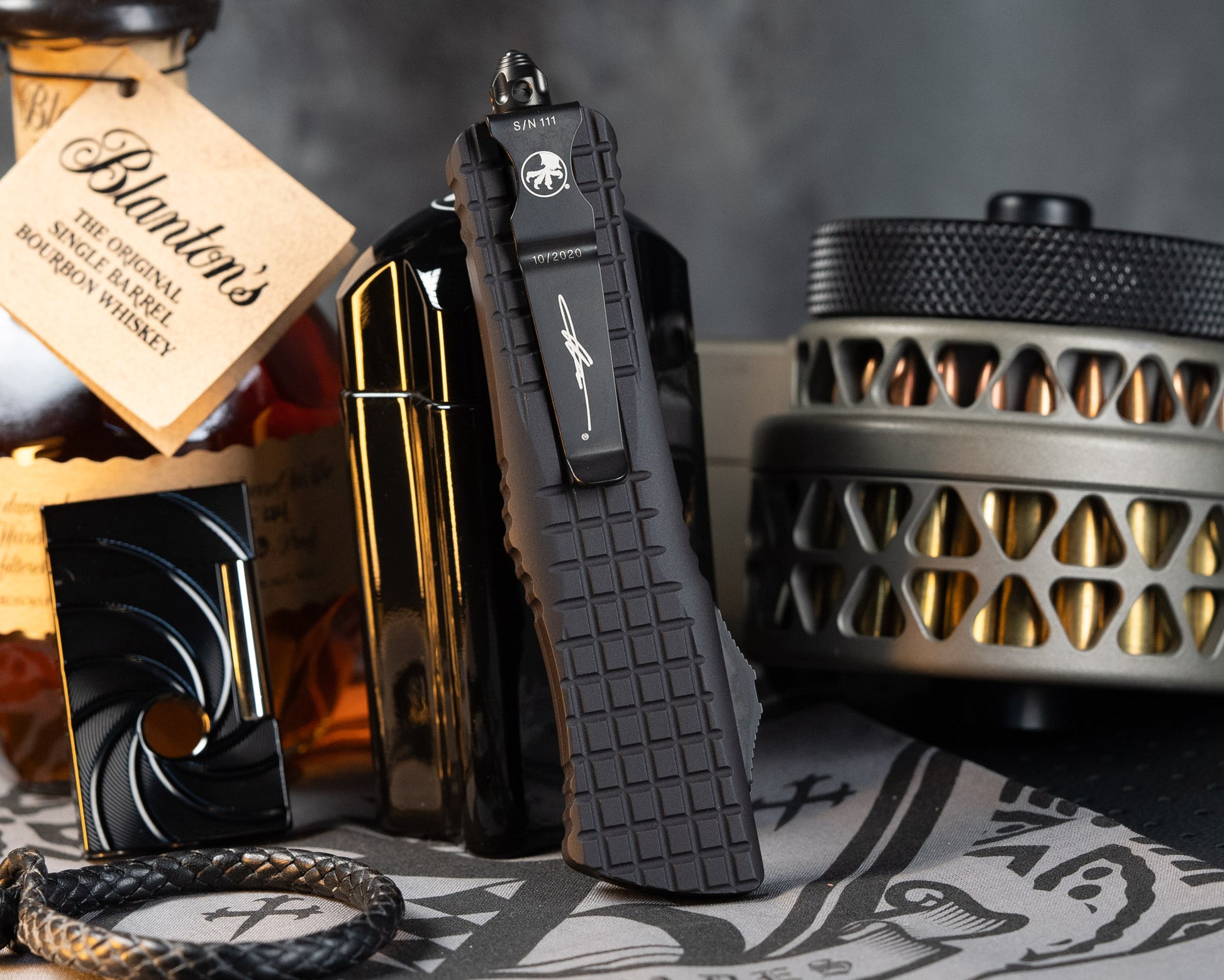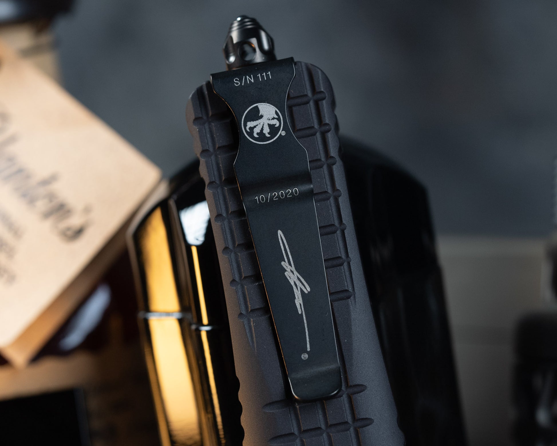 This limited edition signature series Delta Frag model has some major upgrades. Black frag pattern textured anodized aluminum ported chassis allows water, dirt, and debris to flow through the handle. Black DLC finished M390 stainless steel fluted double edge dagger blade with full serrations on one side. Black DLC finished hardware and glass breaker. Note these have standard torx hardware so they can be maintained without special tools. Nickel boron coated interals provide a smoother and corroision recent action. The pocket clip is deep engraved with the serial number, date of manufacture, Claw logo, and signature series logo. Brand new in box.