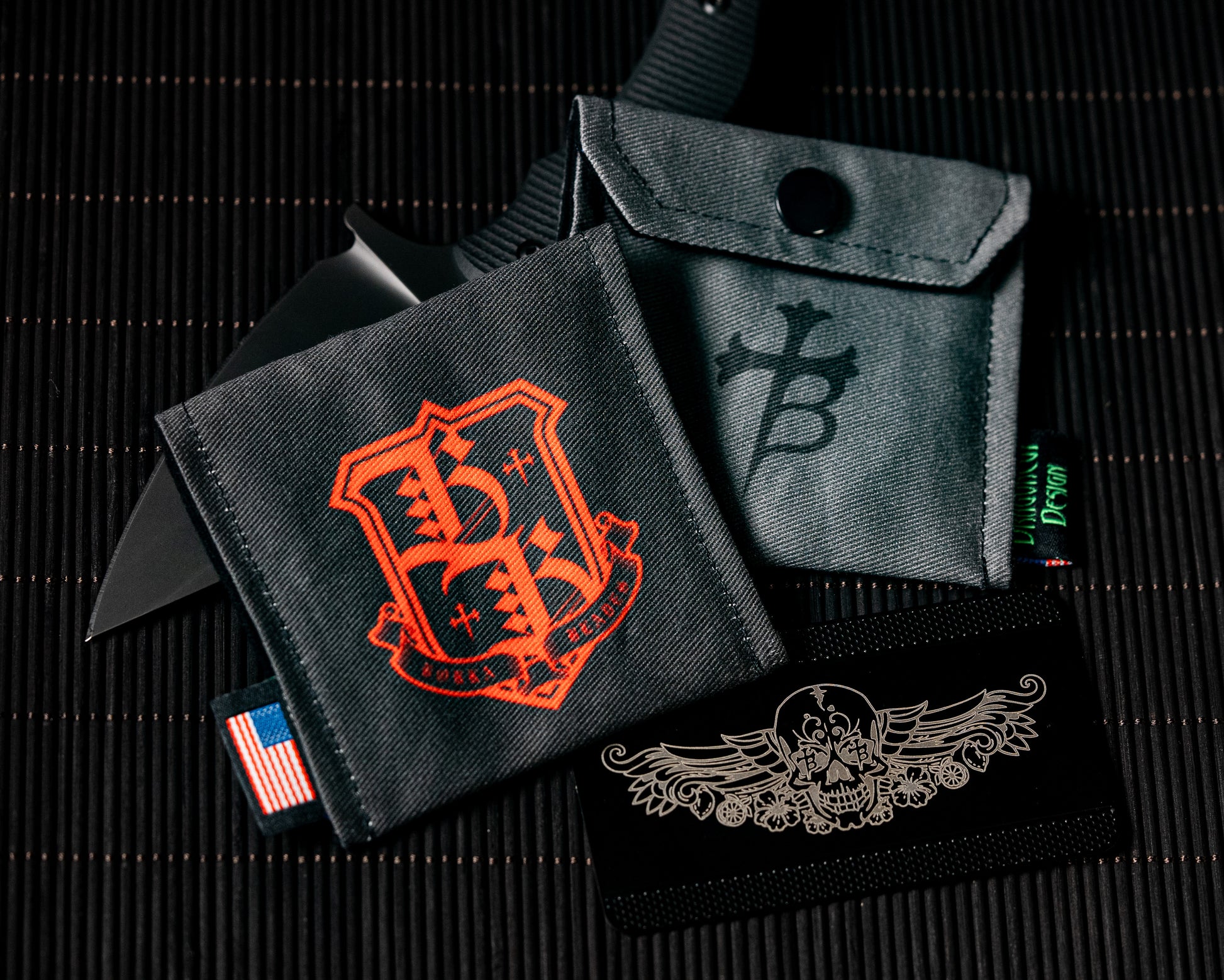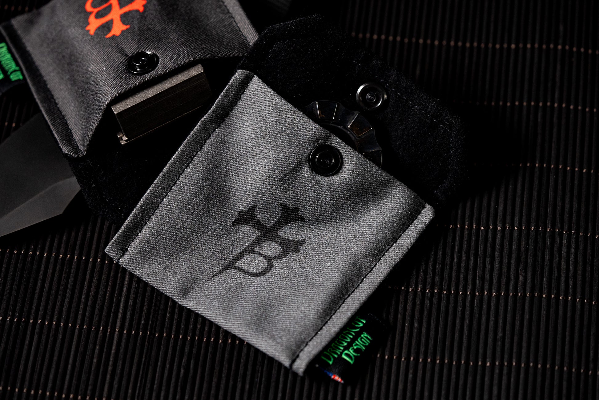 Set of two small square pouches with multiple uses. One is light grey with Borka Crest logo, and the second is dark grey with red "B" Borka logo.