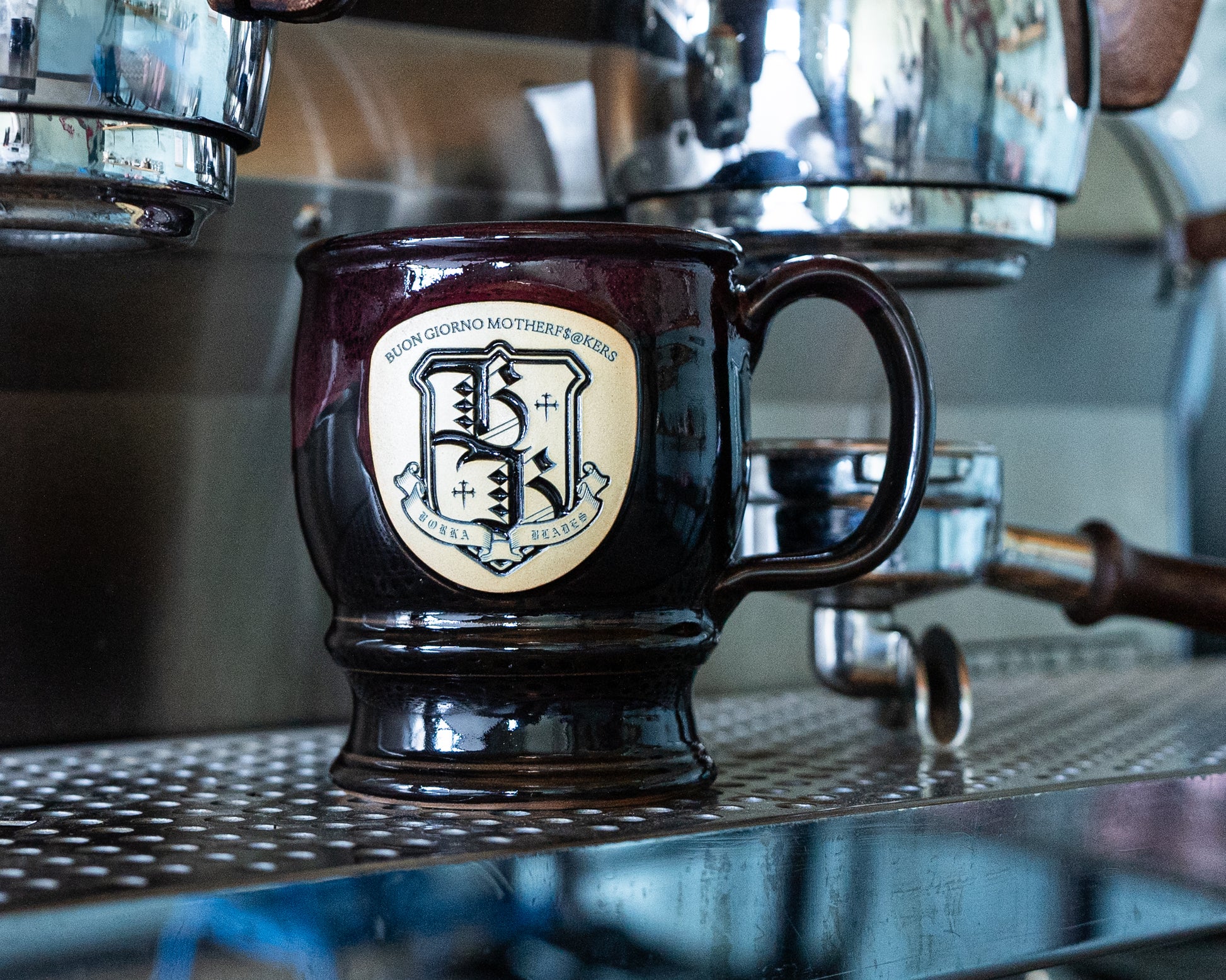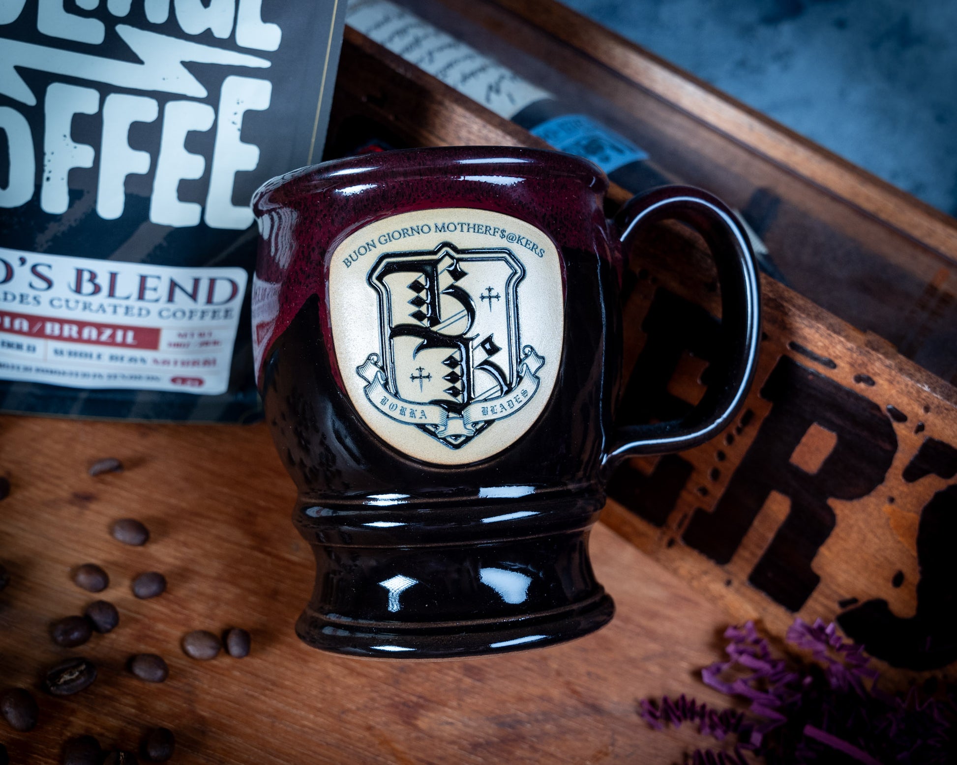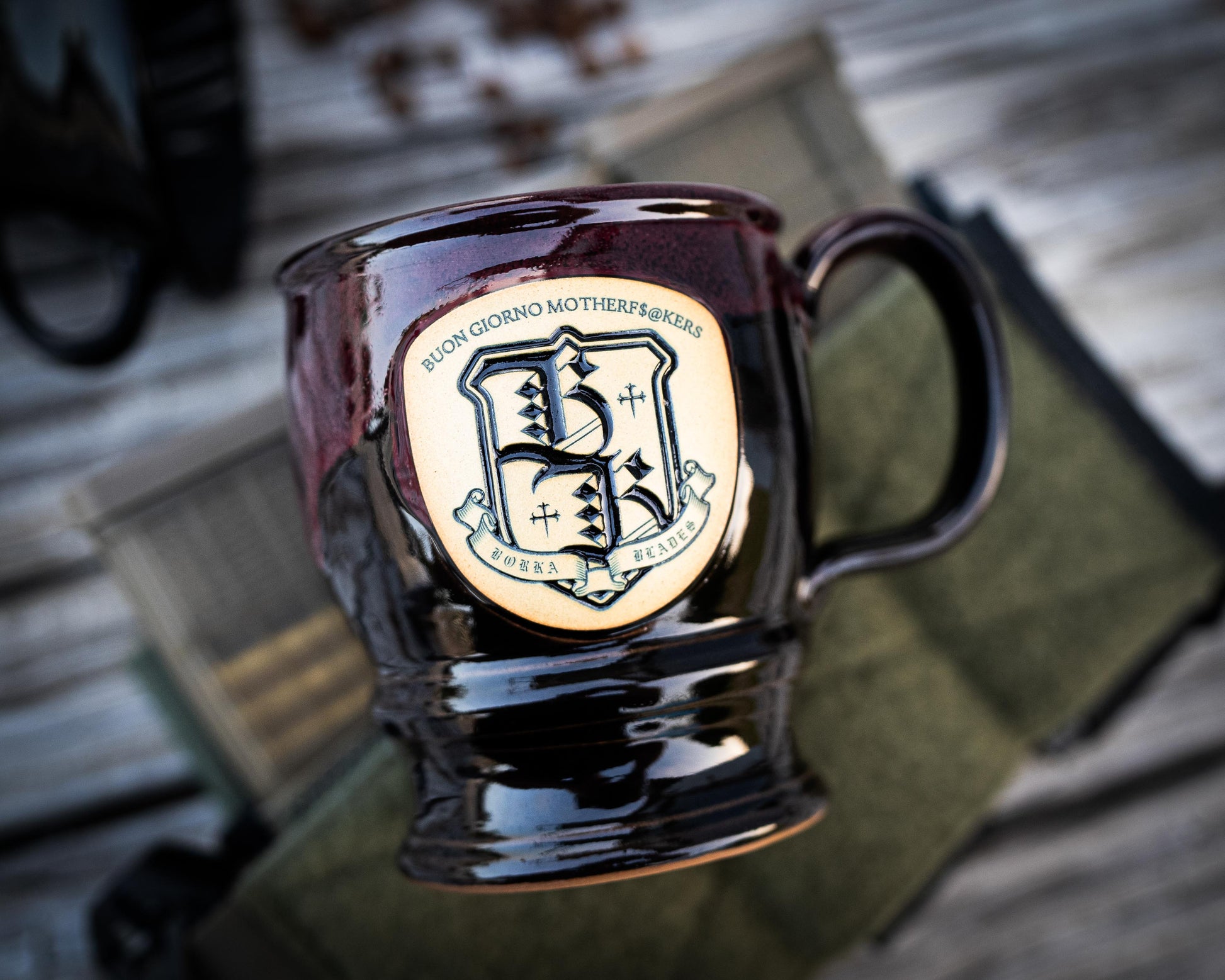Handmade red mug featuring the Borka Blades crest logo and "Boun Giorni Motherf$kers" tagline