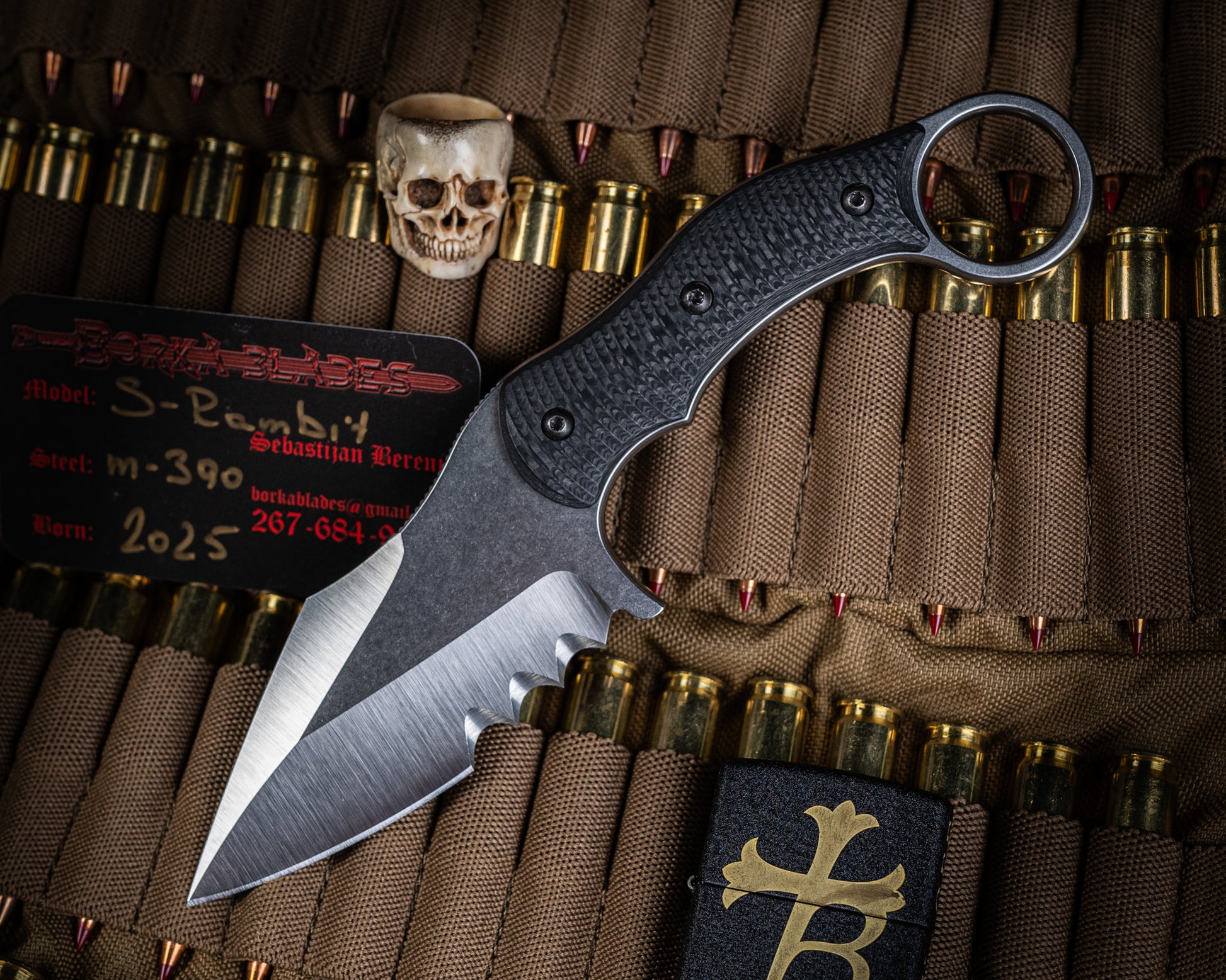 Direct from Sebastijan's hands, this custom hand ground "toothy" SRambit features precise and unique serrations. Comes with leather sheath and COA.