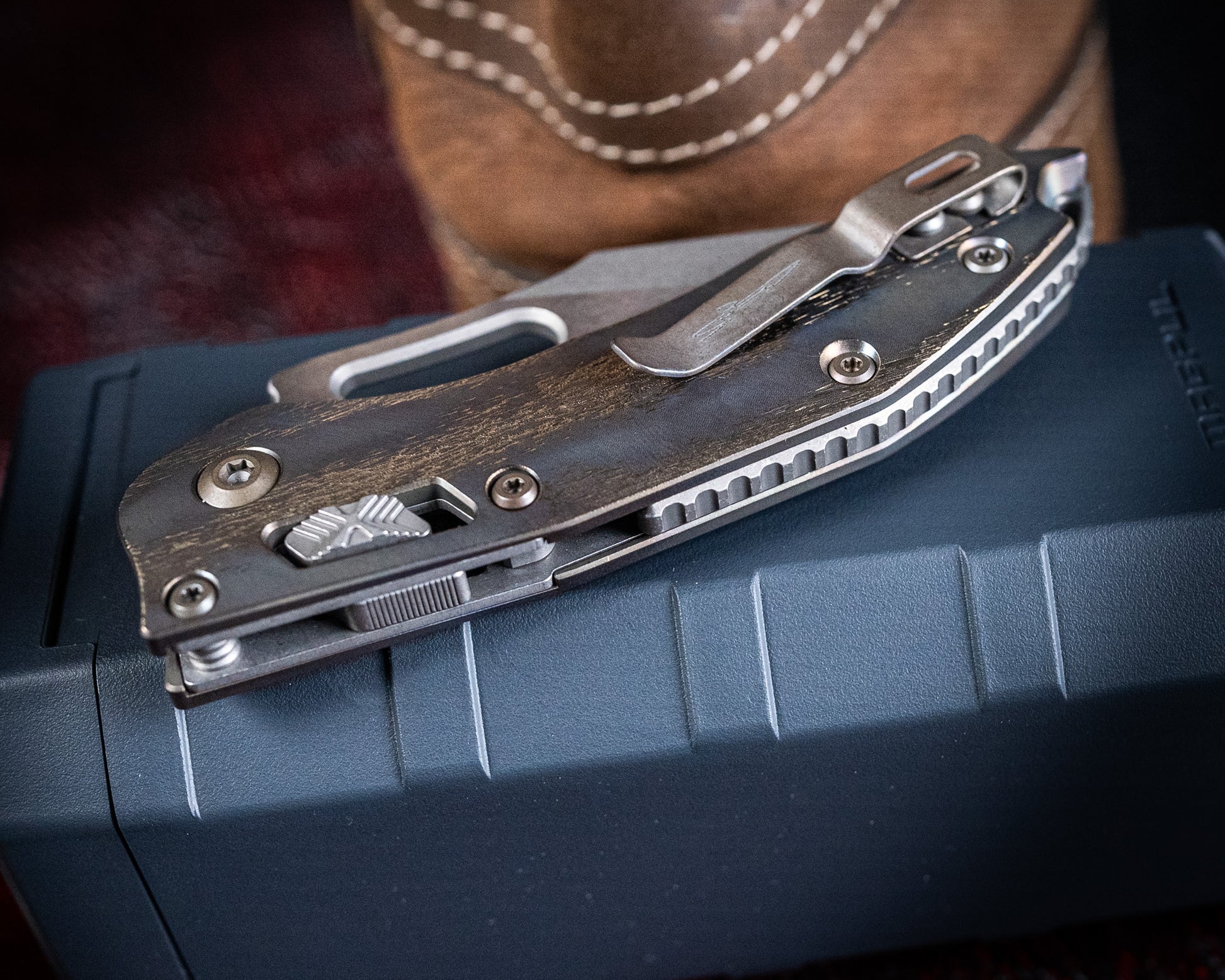 Let's get into the specifics of the Ram-Lok Stitch: Berenji worked closely with Tony Marfione of Microtech Knives based in North Carolina, USA to make a production version of the iconic Stitch model. Overall length is about 8.5" with the Wharncliffe style blade (made from reliable M390MK) sitting at 3.75" and the handle finishing at 5.00". The weight is 6.9 oz in hand. The blade thickness is0.19", and the handle is 0.62" thick.